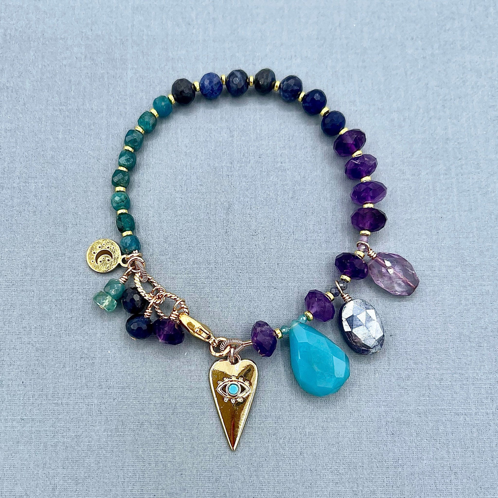 This handmade, one-of-a-kind beautiful bracelet features amethyst faceted 5x8mm rondelles, blue sodalite faceted round 6mm, and blue apatite microfaceted cube 4mm stones. The dangles include dolomite teardrop, mystic moonstone blue oval, and faceted amethyst oval stones. The heart charm and my logo tag are gold-plated. The findings (crimp bead, French wire, jump rings, clasp, and head pins) are gold-filled.