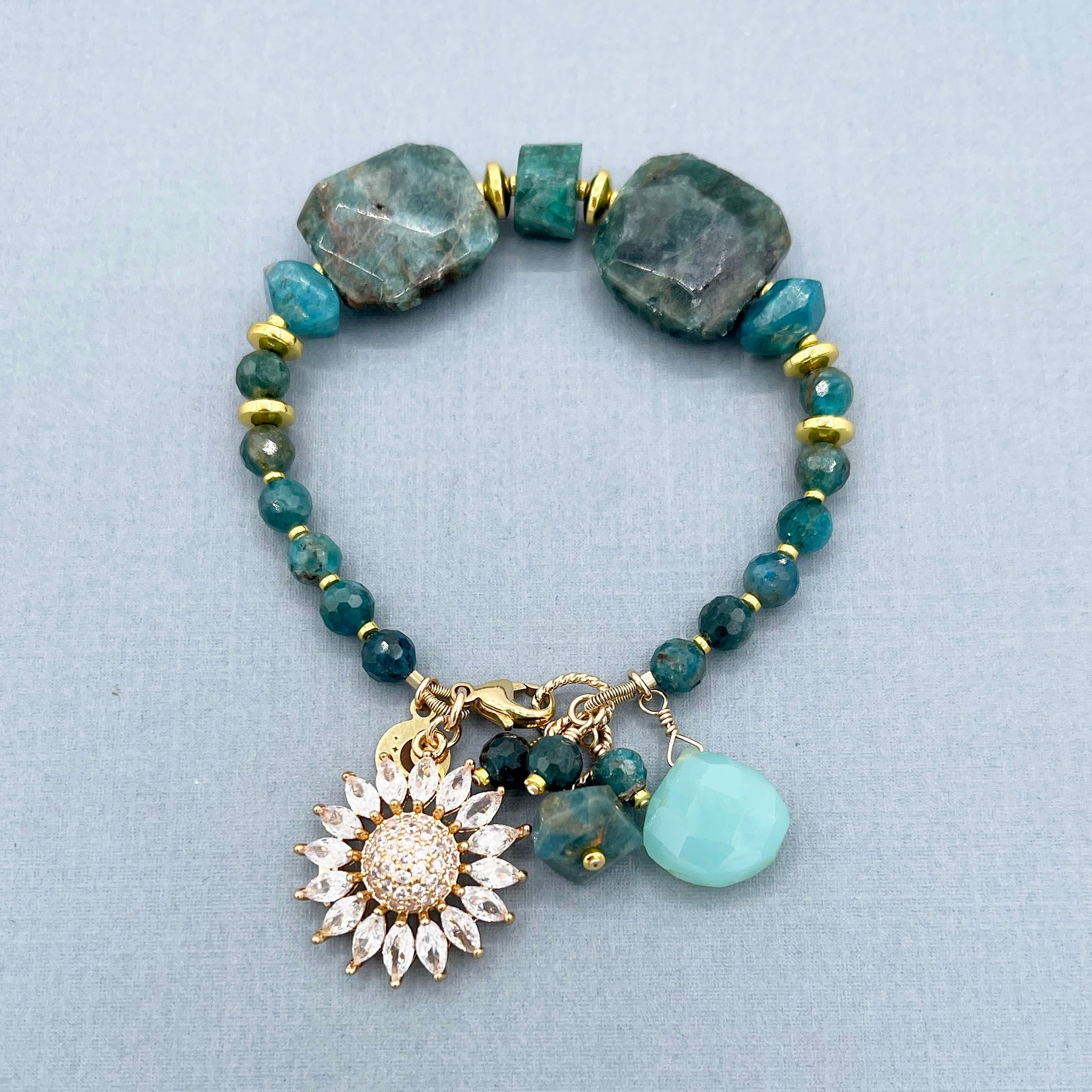 This handmade, one-of-a-kind dazzling bracelet features large faceted apatite, 6mm faceted rounds and hematite spacer beads. The teardrop dangle is dolomite. The flower charm and my logo tag are gold-plated. The findings (crimp bead, French wire, jump rings, clasp, and head pins) are gold-filled.
