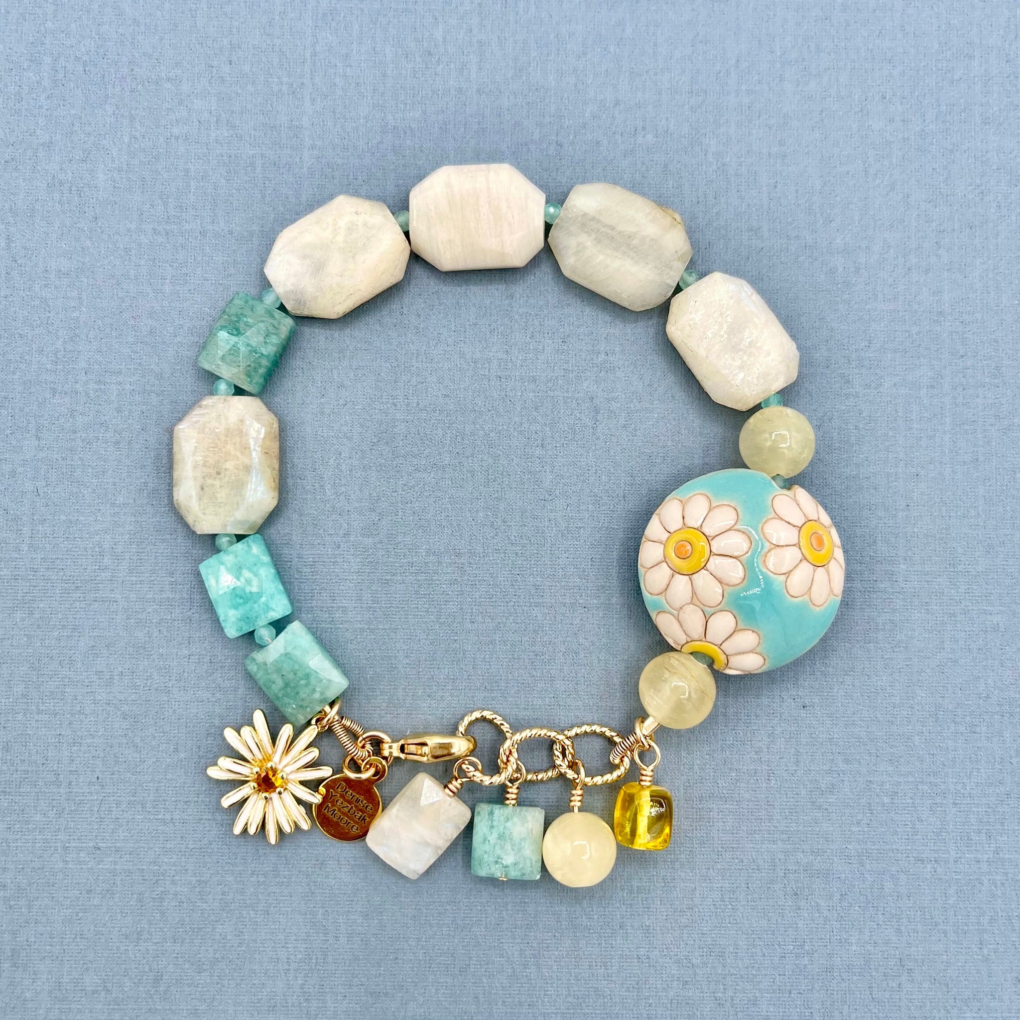 This handmade, one-of-a-kind, beautiful bracelet features sunset moonstone microfaceted flat slab 16x12mm, brazil amazonite (A) microfaceted rectangle 10x8mm, and a Golem Studio daisies on blue carved ceramic lentil 23mm. The dangles include Brazil amazonite (A) microfaceted square 8mm, gold calcite (A) round 8mm, amber ombre tumbled cube 7mm, sunset blue moonstone microfaceted rectangle 10x8mm. The flower charm and my logo tag are gold-plated. The findings (crimp bead, French wire, jump rings, clasp, and head pins) are gold-filled.