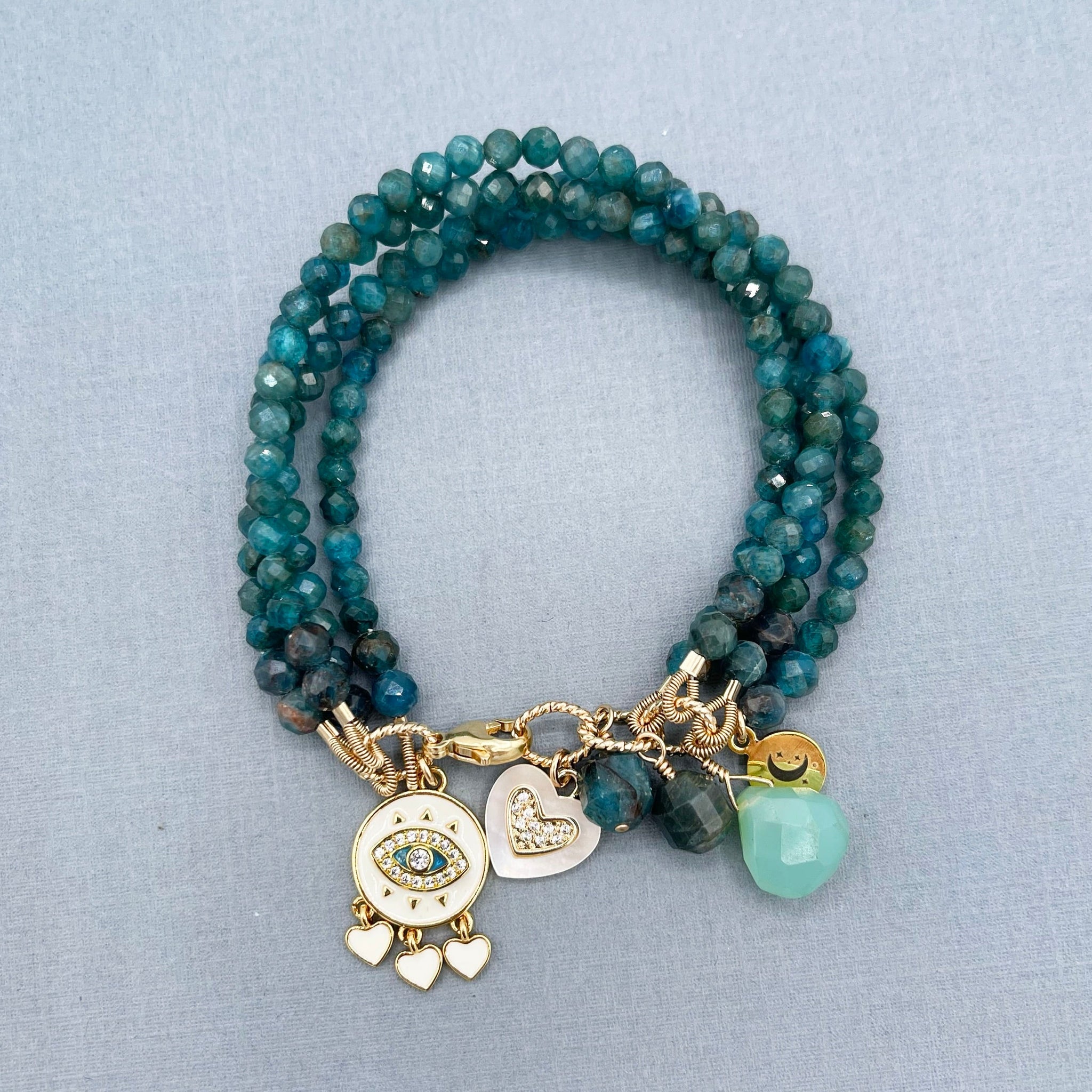 This handmade, one-of-a-kind beautiful bracelet features 4 strands of teal blue apatite microfaceted rounds 4mm. The dangles include apatite and blue dolomite teardrop. My logo tag and heart charms gold-plated. The findings (crimp bead, French wire, jump rings, clasp, and head pins) are gold-filled.