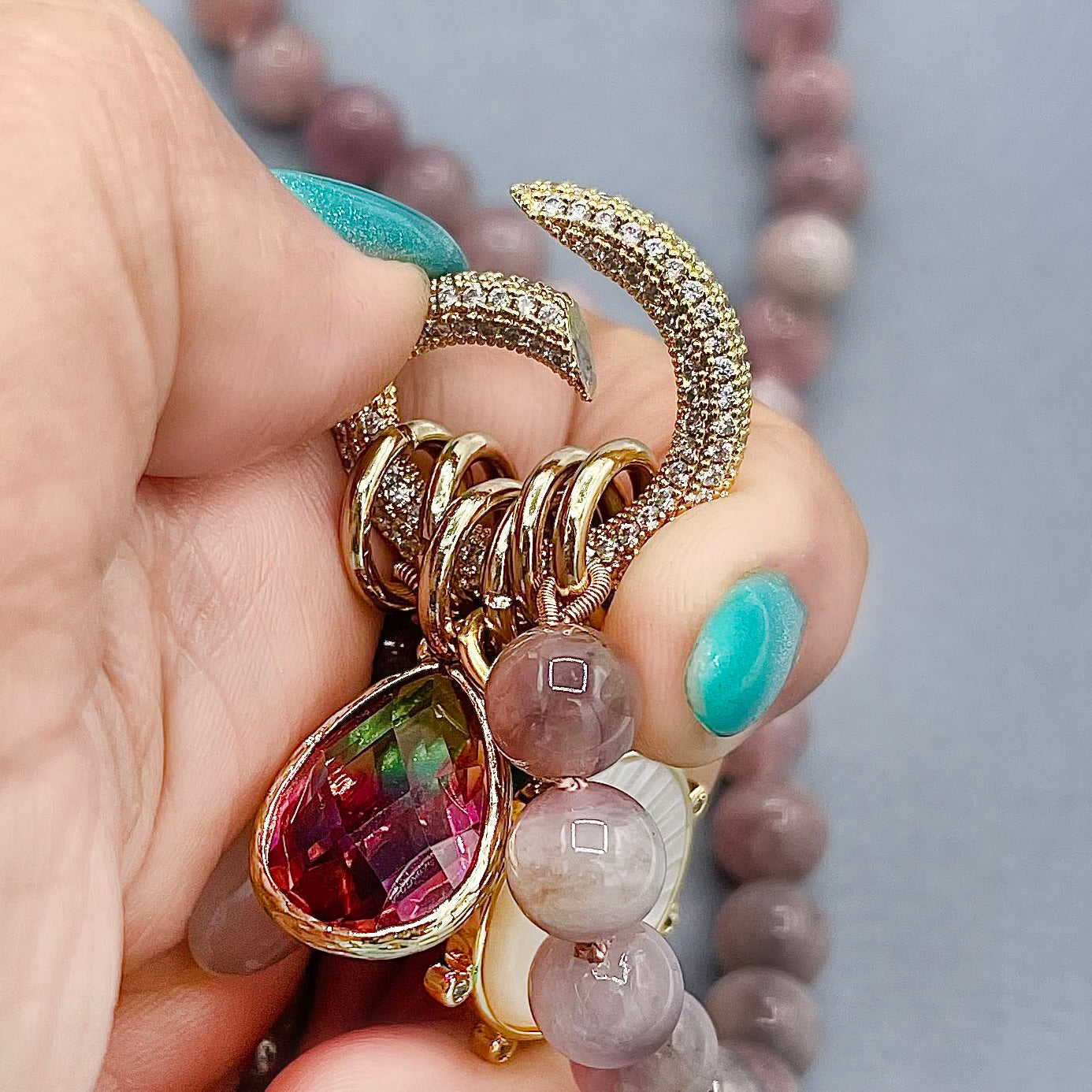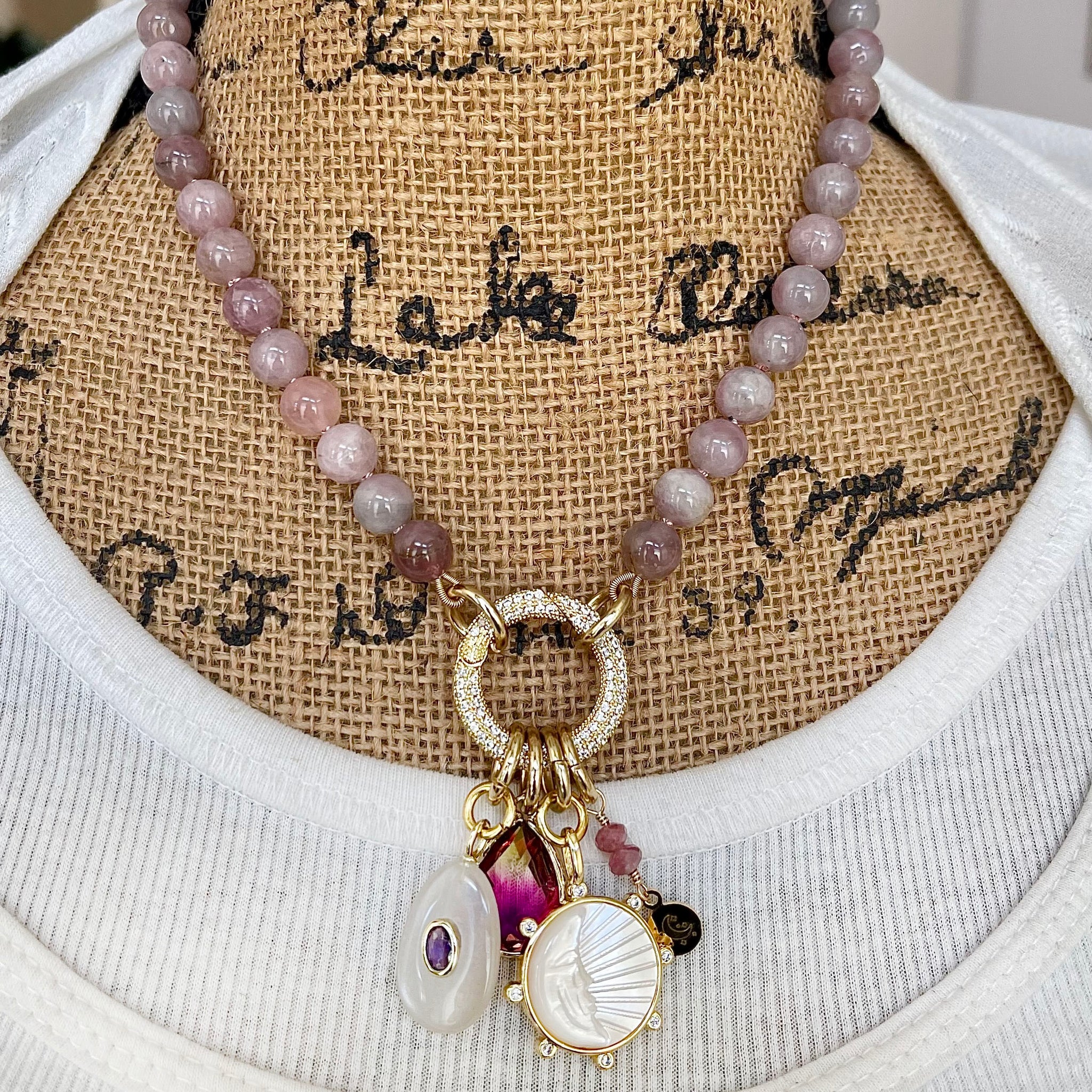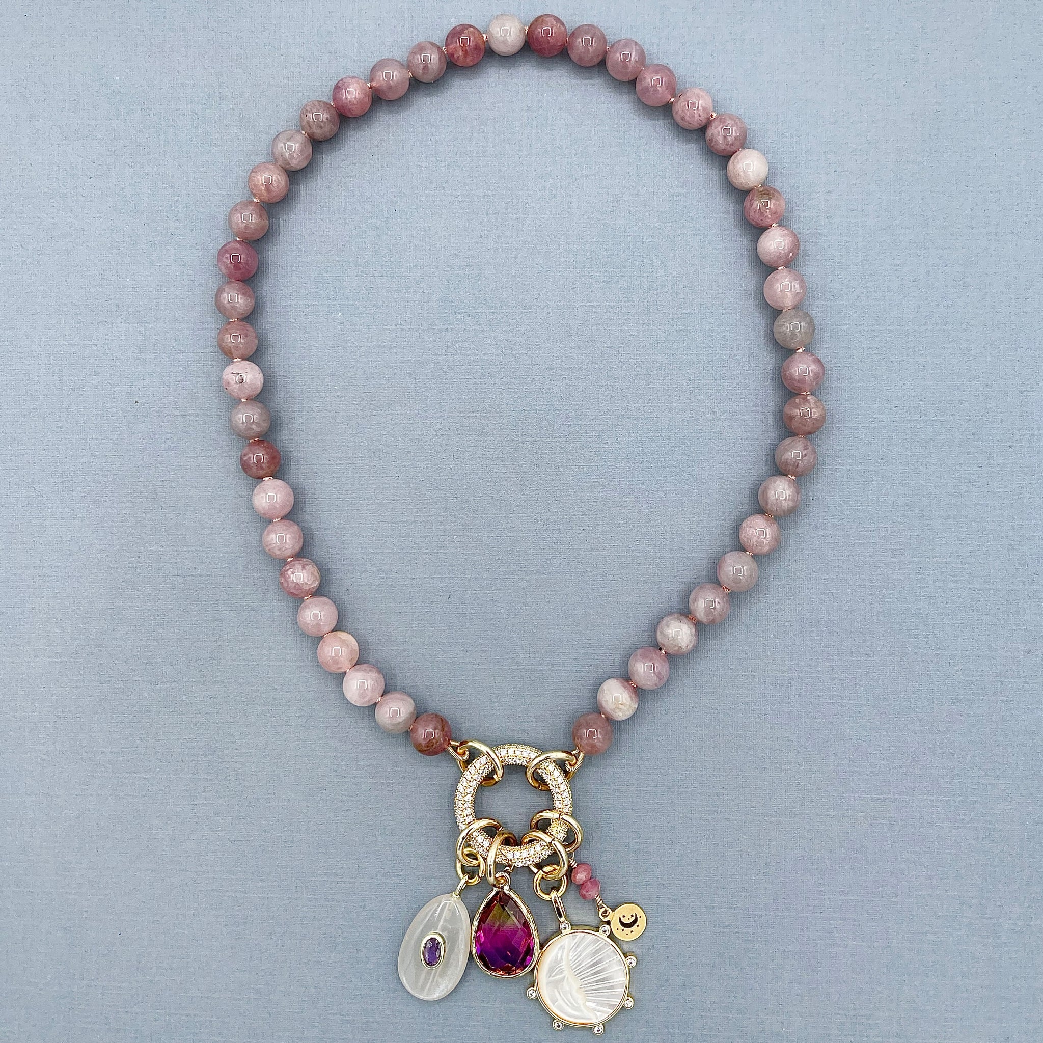 This handmade one of a kind necklace features silk knotted Madagascar rose quartz smooth round 9mm stones. The charms include mother of pearl moon, faceted crystal drop, and a moonstone drop (the center stone is slight off center). The clasp is a hinge push clasp which is gold plated with rhinestones (It can be opened by pushing down). The findings and my logo tag are gold plated.