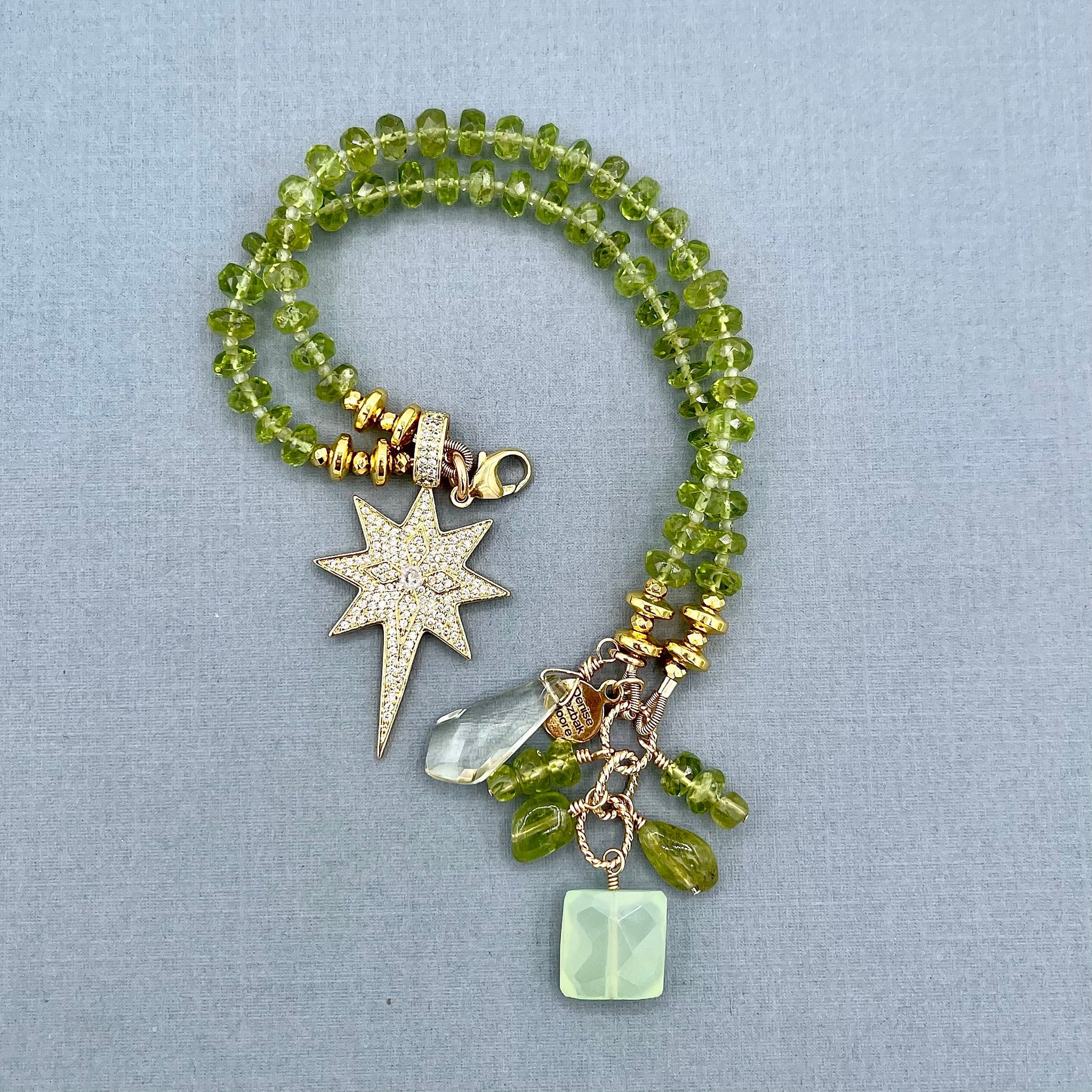 This handmade, one-of-a-kind celestial bracelet features 2 rows of peridot (A) faceted rondelles 6mm, and hematite smooth rondelle disks 6mm & microfaceted rondelles 3mm. Dangles include peridot microfaceted 4mm cubes, nuggets, green dolomite rectangle, and quartz crystal drop. The large star charm and my logo tag are gold-plated. The findings (crimp bead, French wire, jump rings, clasp, and head pins) are gold-filled.