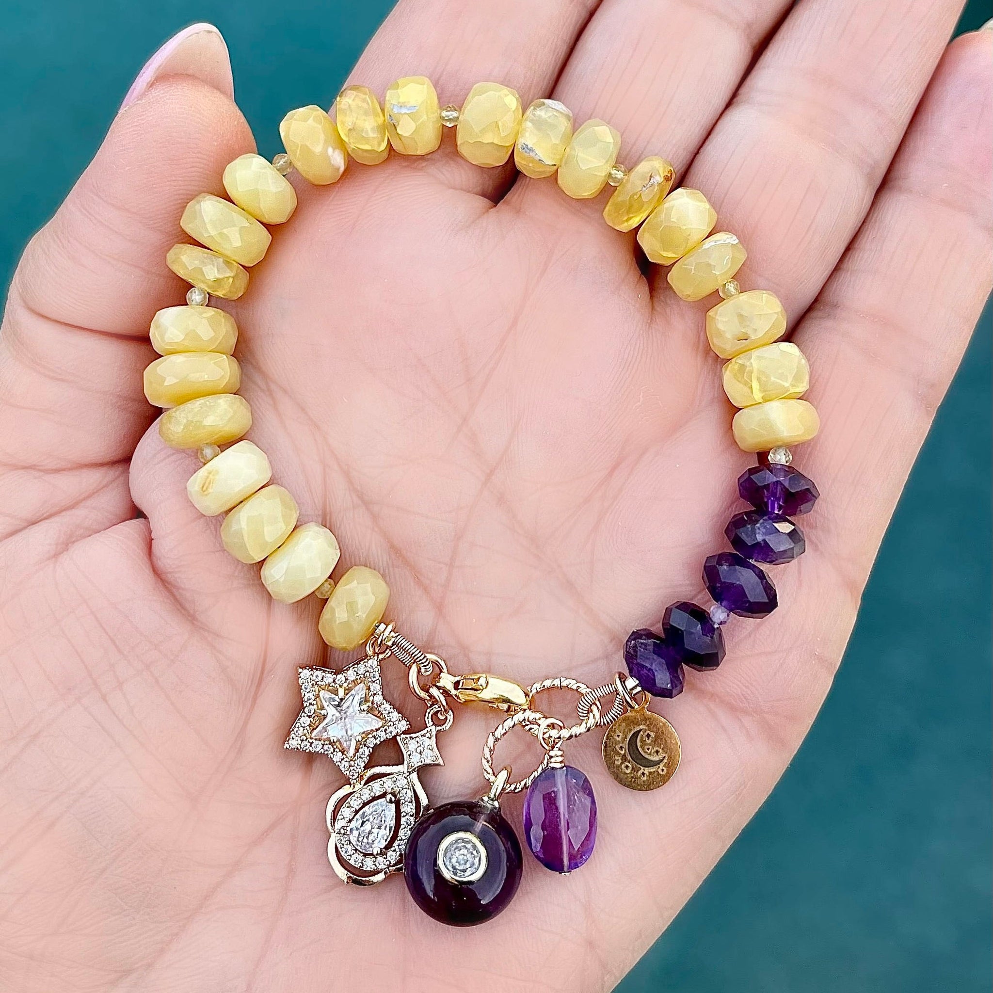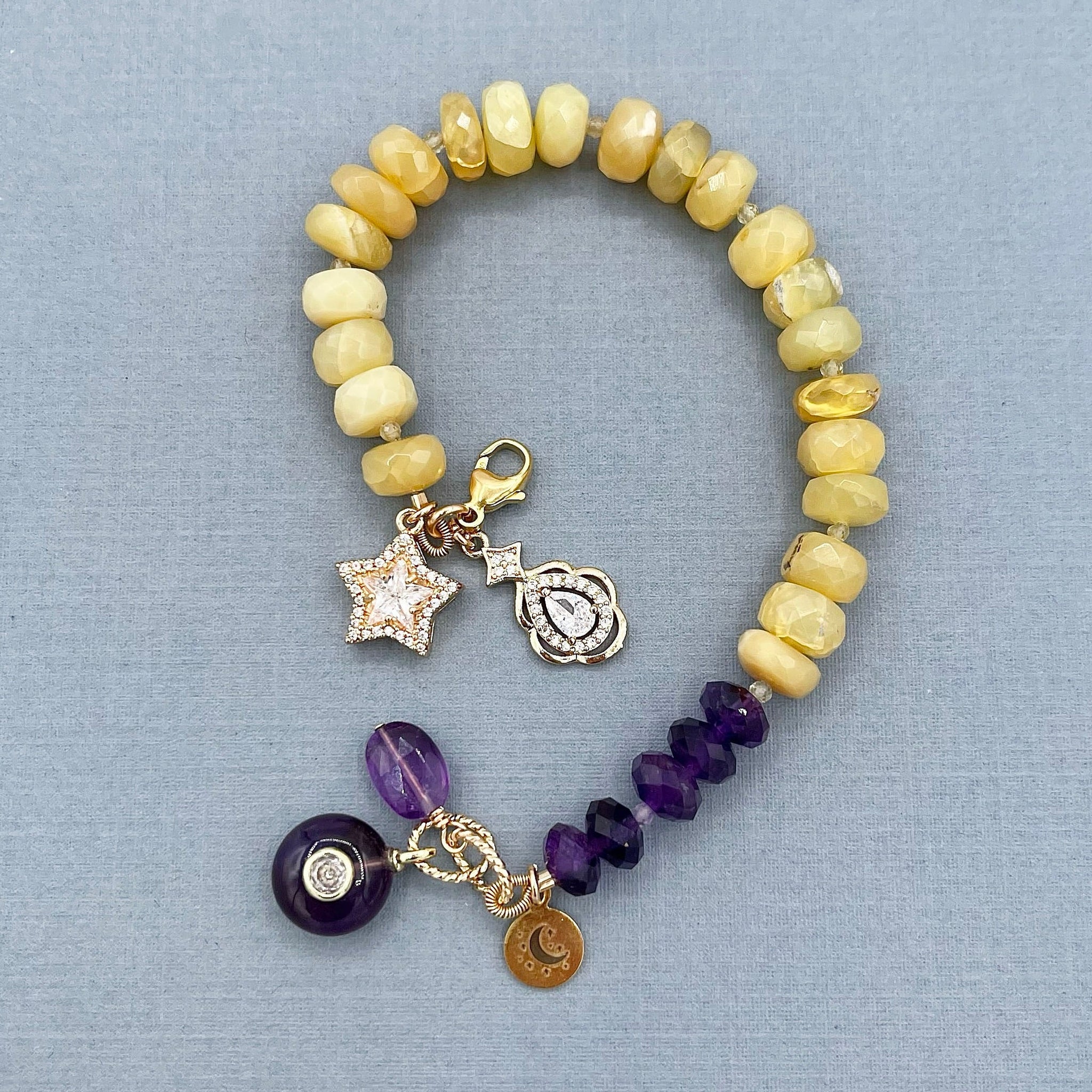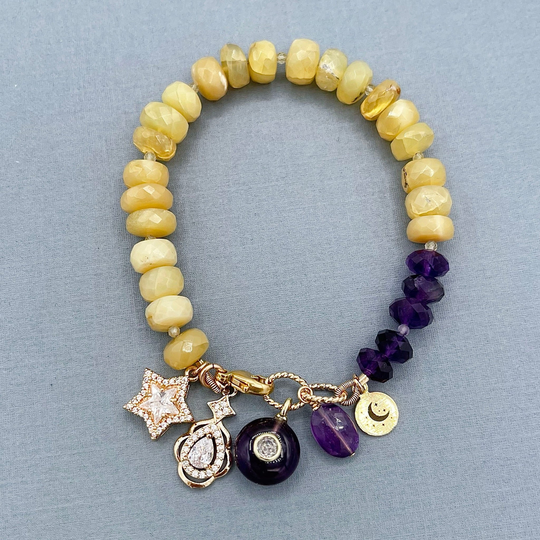 This handmade, one-of-a-kind, beautiful bracelet features yellow aventurine faceted rondelles 6x8mm and amethyst faceted rondelles 5x8mm. Dangles include gold plated amethyst round, and faceted amethyst oval. The charms and my logo tag are gold-plated. The findings (crimp tube, French wire, jump rings, clasp, and head pins) are gold-filled.