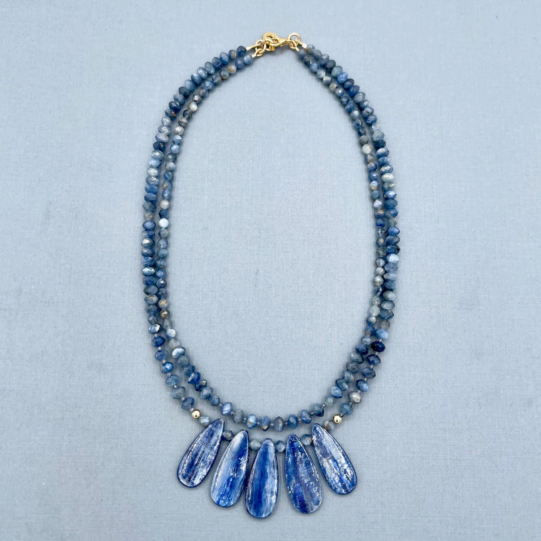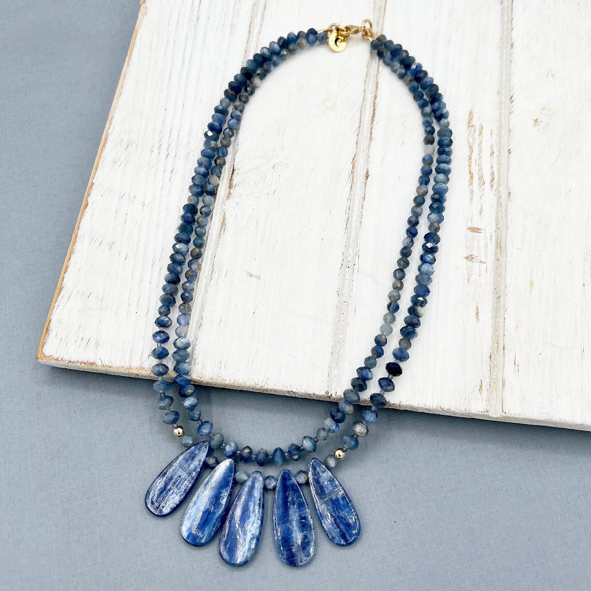 This handmade bohemian necklace features blue kyanite (A) faceted rondelles 4x6mm, blue kyanite microfaceted 4mm rounds, blue kyanite (A) smooth teardrops (12x30mm, and aquamarine (A) microfaceted 2mm round spacer beads. The findings are gold filled. My logo tag is gold plated
