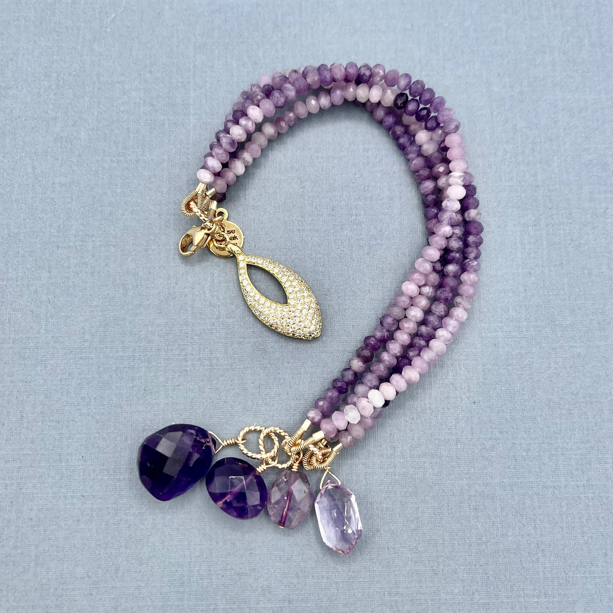 This handmade, one-of-a-kind, beautiful bracelet features four strands of lepidolite ombre microfaceted rondelles 3x4mm. The dangles include 4 amethyst faceted stones. The charm and my logo tag are gold-plated. The findings (crimp bead, French wire, jump rings, clasp, and head pins) are gold-filled.