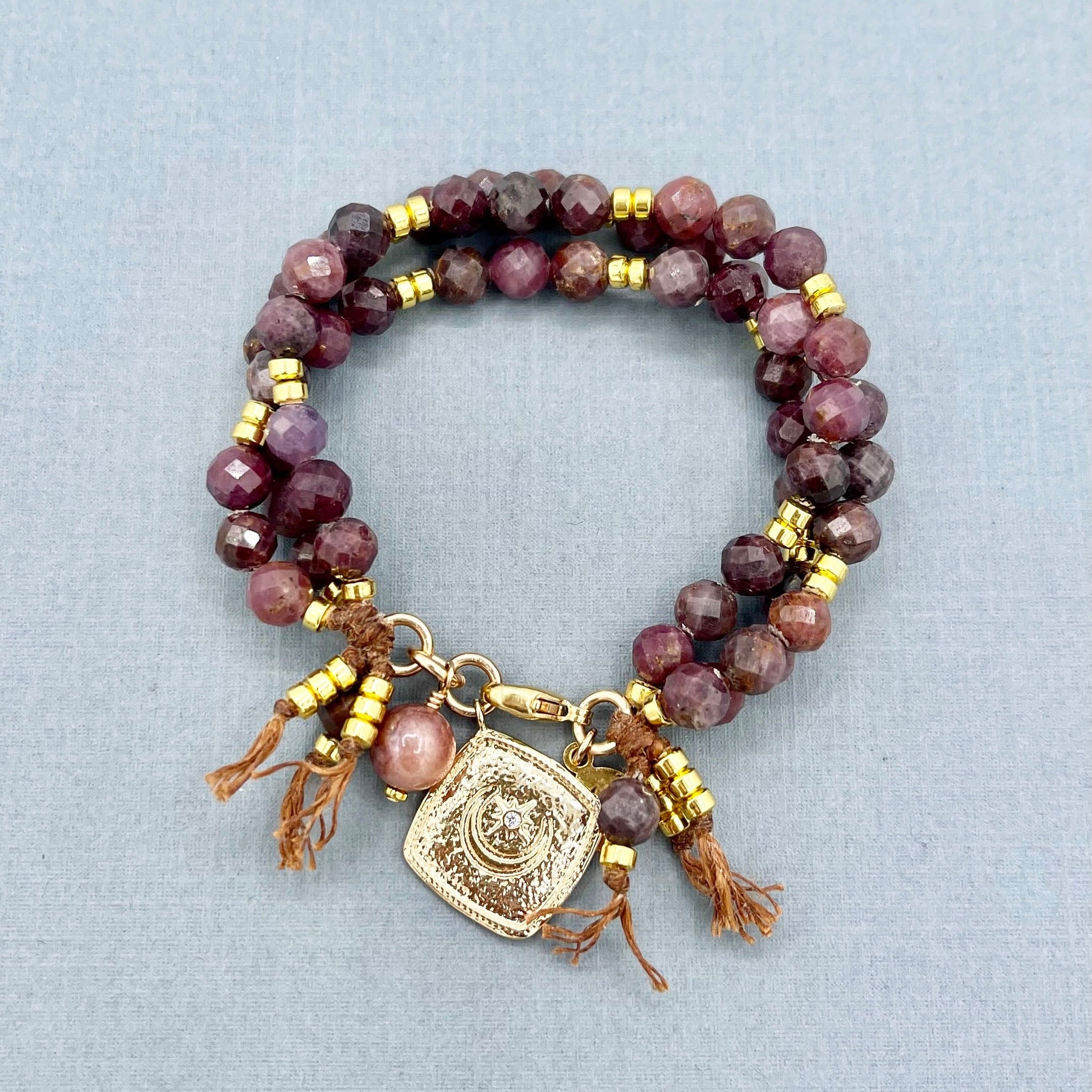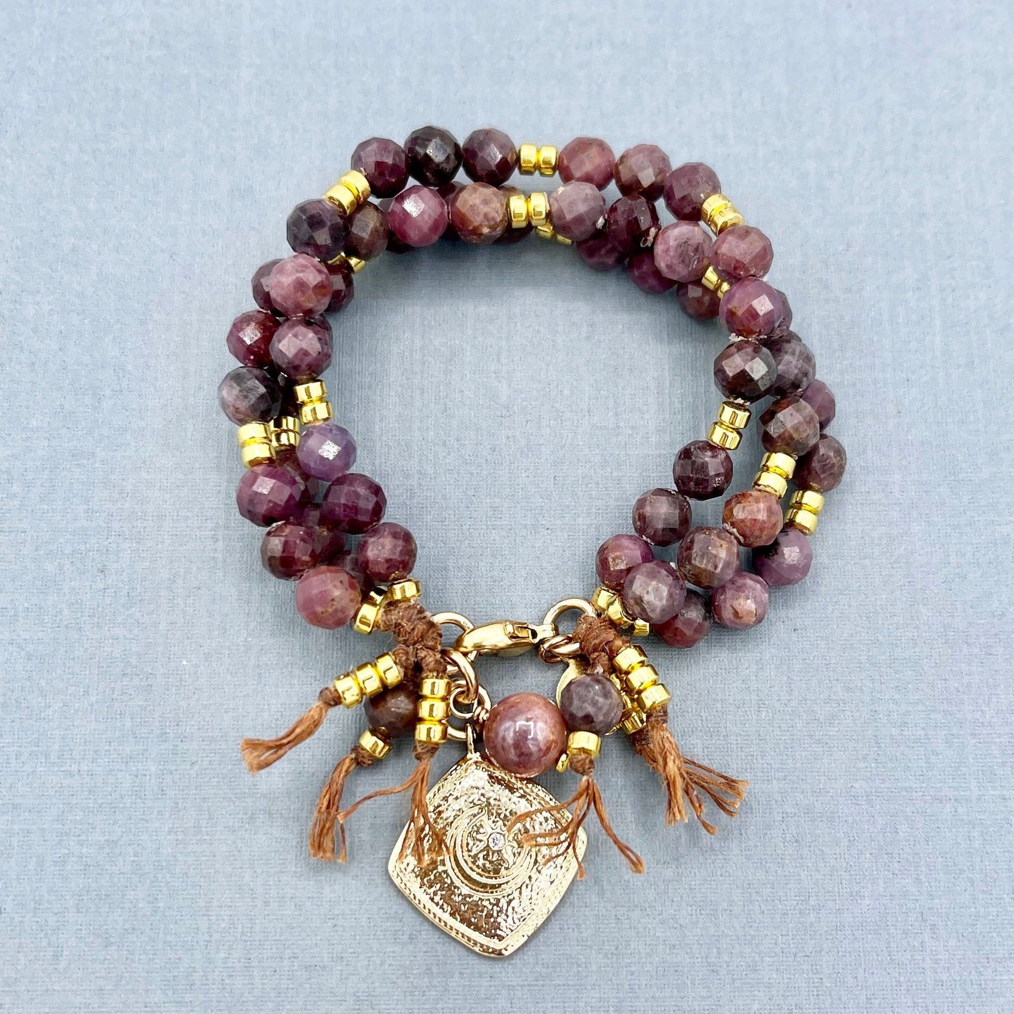 This handmade, one-of-a-kind knotted waxed linen corded bohemian bracelet features 3 strands of ruby microfaceted rounds 6mm and hematite smooth rondelle disks 3mm brright gold. The 8mm round is mystic coated moonstone. My logo tag and moon charm are gold-plated. The findings (jump rings, clasp, and head pins) are gold-filled.
